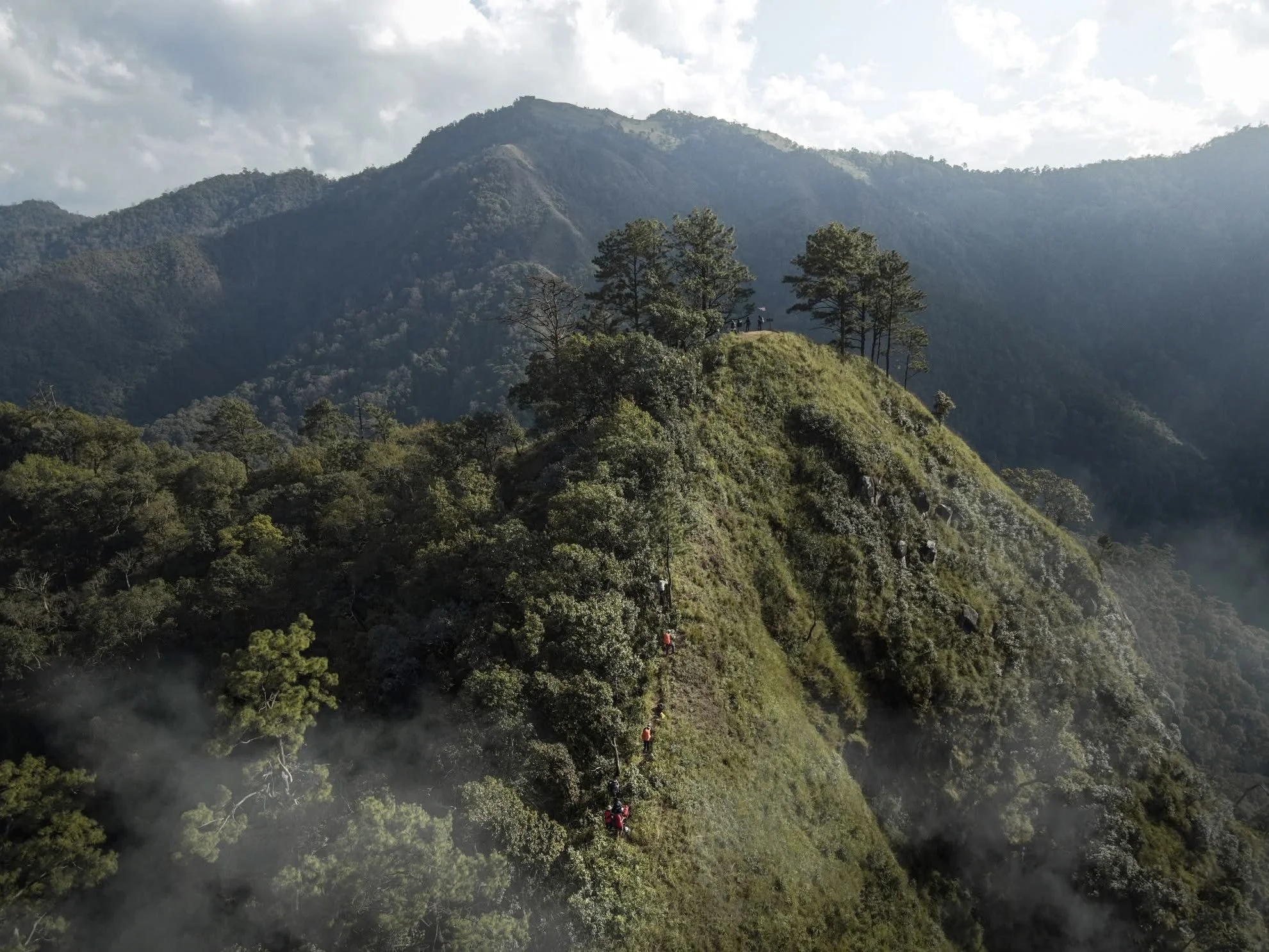 Before dawn, we hike to the summit of Doi Lang Luang (2,031 m). As the sun rises, golden light reveals a vast panorama of surrounding peaks — including Doi Pha Ngom, Doi Mod, Doi Inthanon, and, on clear days, Chiang Dao.